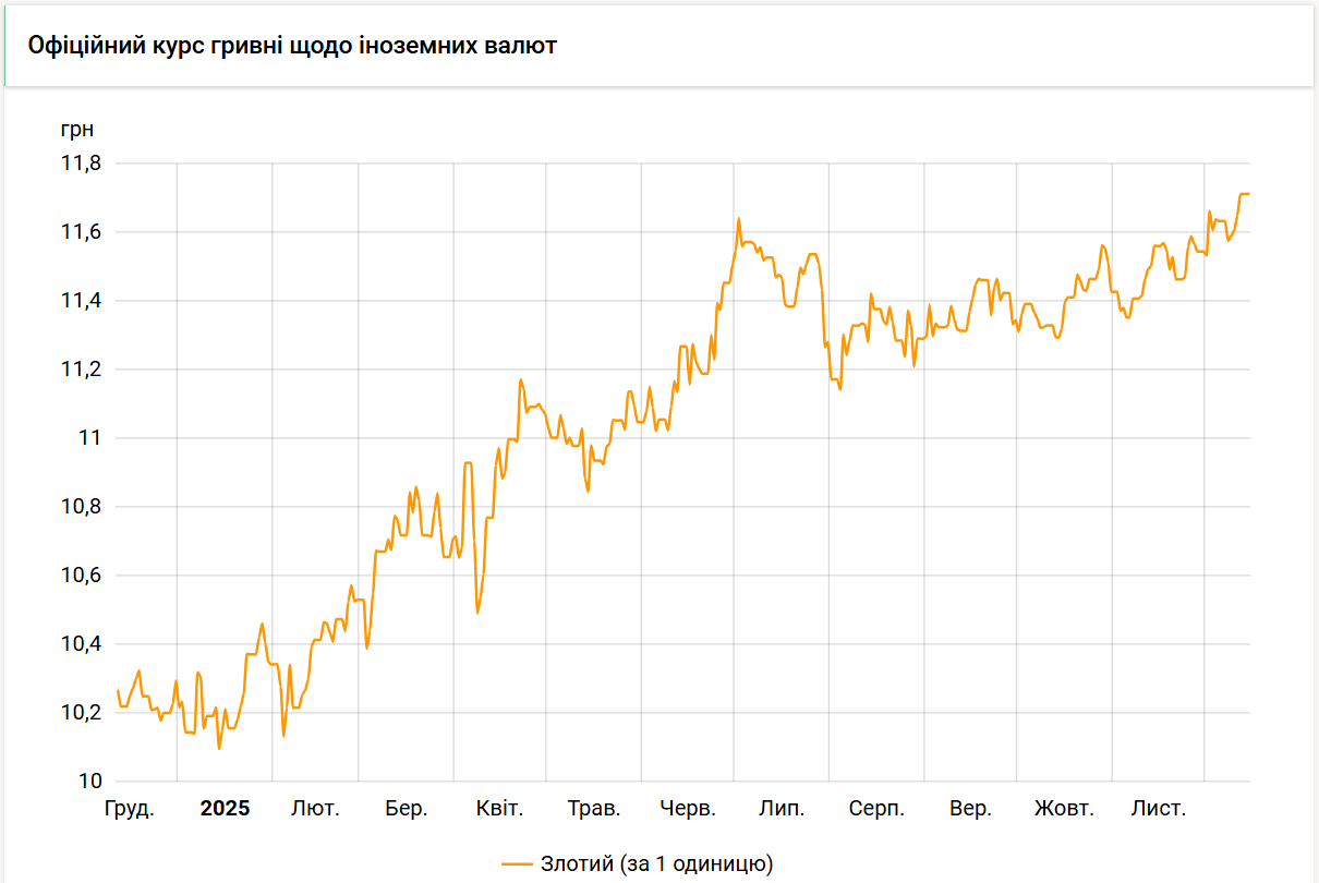 bank.gov.ua На готівковому ринку обмінні пункти купують злотий у середньому по 11,30 гривень і продають по 11,73 гривень. Ці курси знизилися на 4-7 копійок порівняно з 11 грудня. З початку листопада (11,08-11,52 гривень) ці курси зросли на 21-22 копійки, а з 1 січня (9,6-10,5 гривень) на 1,23-1,70 гривень. НБУ встановлює курс гривні до польського злотого щодня на підставі котирувань пари злотий-долар на польському ринку. НБУ знизив курс долара до гривні на 8 копійок. Офіційний курс на 15 грудня 2025 року встановлено на такому рівні: 42,1936 гривень за 1 долар (-0,08 грн). Офіційний курс євро становить 49,4678 гривень за 1 євро (-0,05 грн). Курси купівлі-продажу долара на міжбанківському ринку сьогодні становлять 41,96-42,48 гривень, що на 4-8 копійок нижче за курс 11 грудня. Курси євро перебувають на рівні 49,23-49,86 гривень (зростання на 6-8 копійок порівняно з 11 грудня).