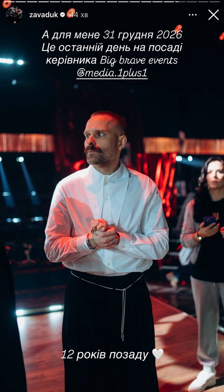 Продюсер Володимир Завадюк більше не очолює українську продакшн-компанію Big Brave Events, яка, зокрема, працювала над створенням шоу "Танці з зірками" для телеканалу 1+1 Україна. Про це пише РБК-Україна з посиланням на Instagram Володимира. У дописі, в якому Завадюк повідомив про своє звільнення з "плюсів", він зазначив, що 31 грудня 2026 року для нього останній день на посаді керівника Big Brave Events.  Водночас у повідомленні, ймовірно, йдеться про 2025 рік - описку могли допустити напередодні Нового 2026 року, адже малоймовірно, що продюсер заздалегідь оголошував би про відхід за рік. За його словами, на посаді керівника компанії він пропрацював 12 років.