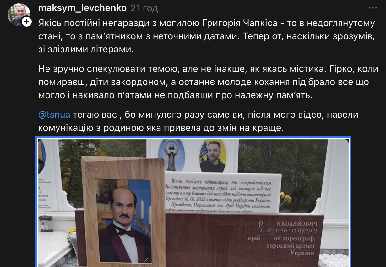 У мережі знову занепокоєні станом могили Григорія Чапкіса (фото: threads.com/@maksym_levchenko)