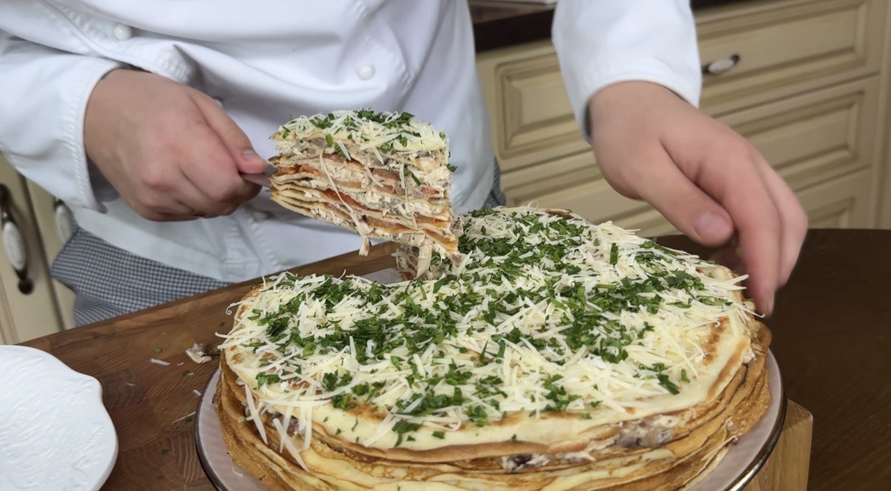 Їжте млинці по-новому: рецепт солоного торта зі смачною начинкою