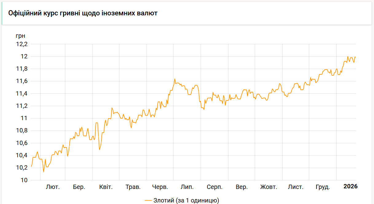 На початку року офіційний курс злотого становив 11,8015 гривень, за цей час він зріс на 19 копійок.
