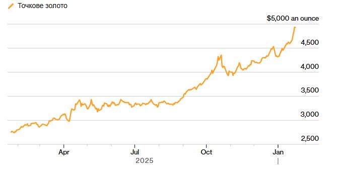 У п'ятницю, 23 січня ціна на золото досягла нової вершини - майже 5000 доларів за унцію. Разом із золотом рекордно подорожчали й інші дорогоцінні метали.