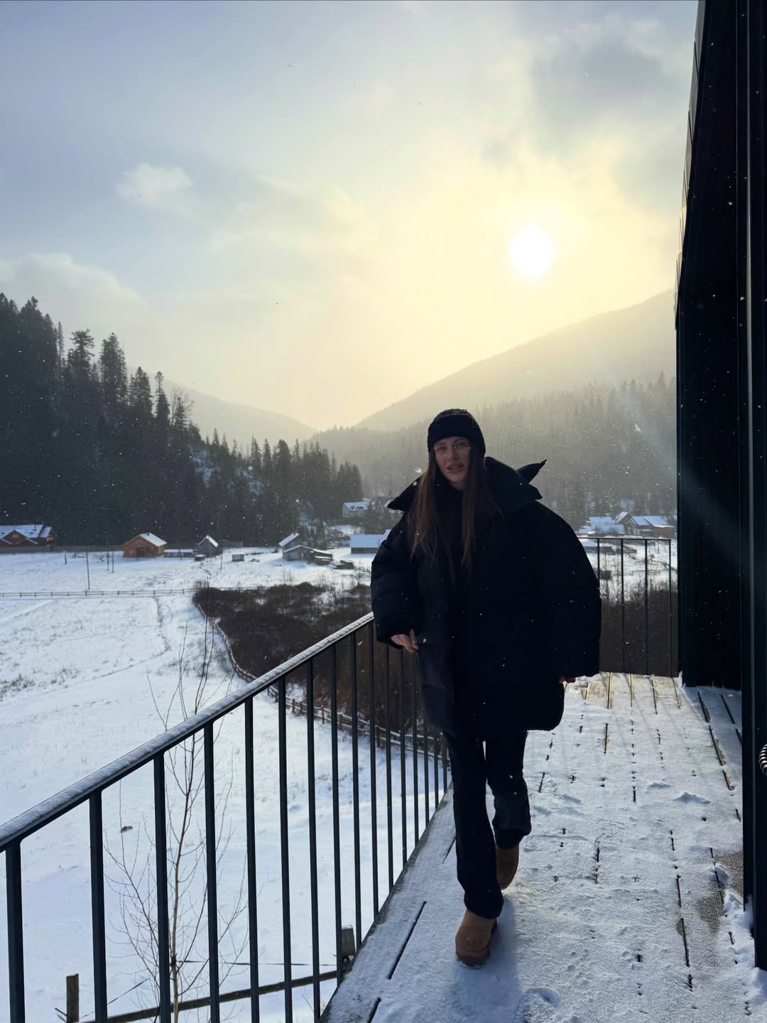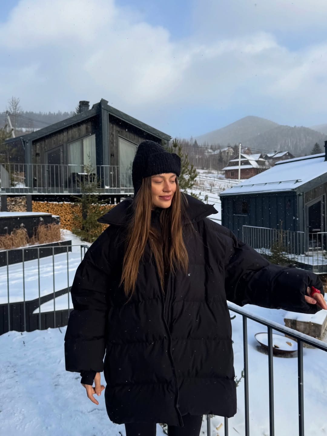 Oversize-пуховик, небанальний головний убір і акцентне взуття формують сучасний зимовий look, який доречно виглядає навіть у засніжених горах.