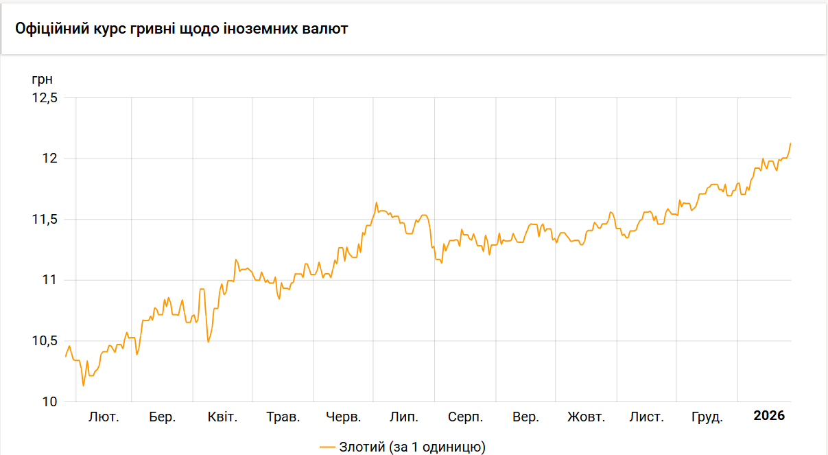НБУ встановлює курс гривні до польського злотого щодня на підставі котирувань пари злотий-долар на польському ринку. Нагадаємо, що на 27 січня офіційний курс долара знизився на 1 копійку - до 43,13 гривень, а курс євро досяг рекордного рівня - 51,42 гривень (+0,42 порівняно з попереднім днем). Офіційний курс євро, який встановлює Європейський центральний банк, за період з 16 до 23 січня включно зріс на 1% - з 1,16 до 1,17 доларів. Водночас індекс спотової вартості долара щодо валют 10-ти найбільших торговельних партнерів США, який публікує агентство Bloomberg, знизився за цей період на 2% - з 99 393 до 97 312 доларів. Офіційний курс злотого на 26 січня становив 12,05 гривень, що на 2 копійки більше за попередній день. Протягом 2025 року офіційний курс злотого зріс із 10,15 до 11,80 гривень (+16% або 1,65 гривень).