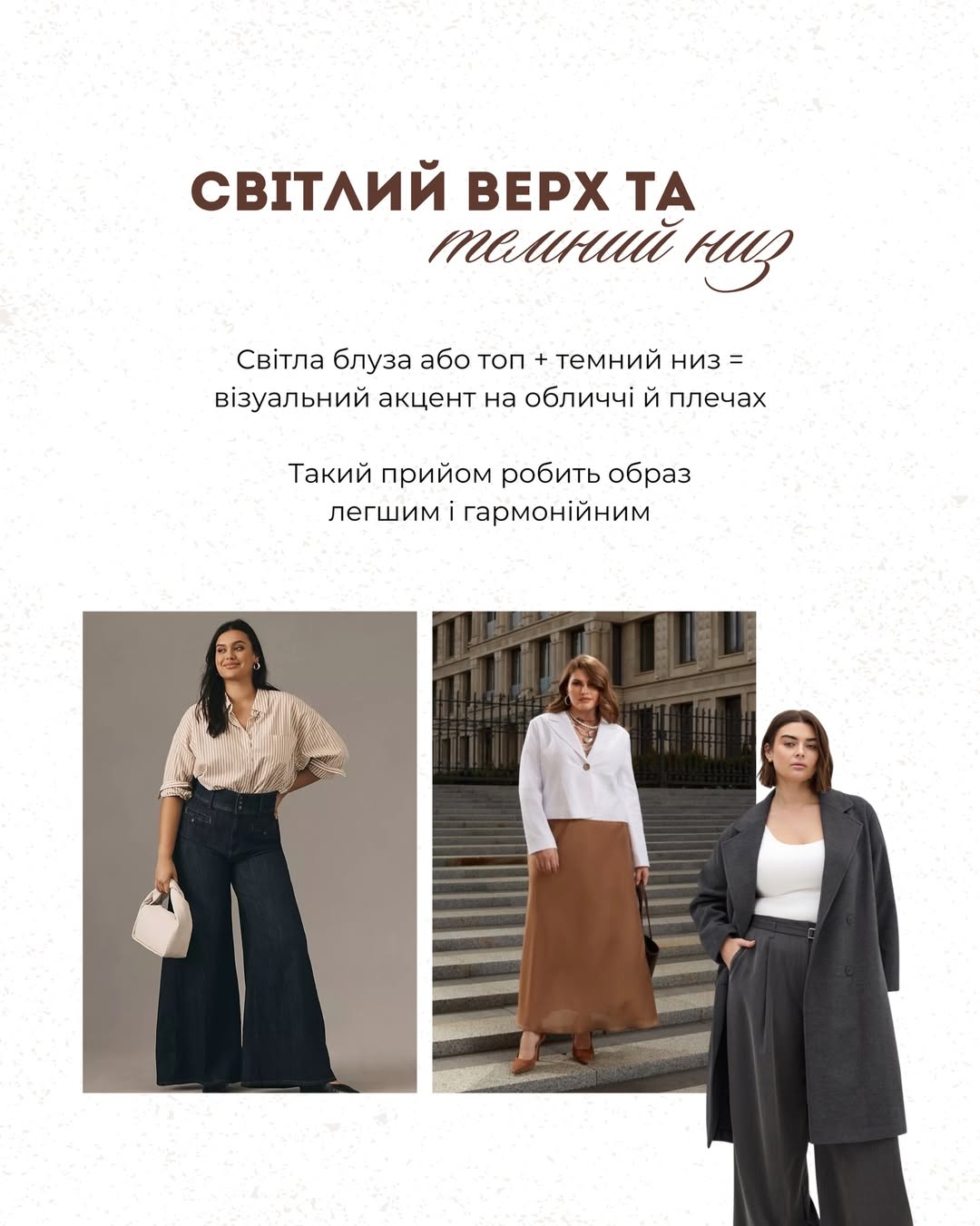 Класичний прийом - поєднання світлого верху з темним низом - залишається актуальним. Світла блуза або топ акцентують увагу на обличчі та плечах, а темні штани чи спідниця роблять нижню частину силуету візуально легшою. Такий контраст додає образу гармонії.
