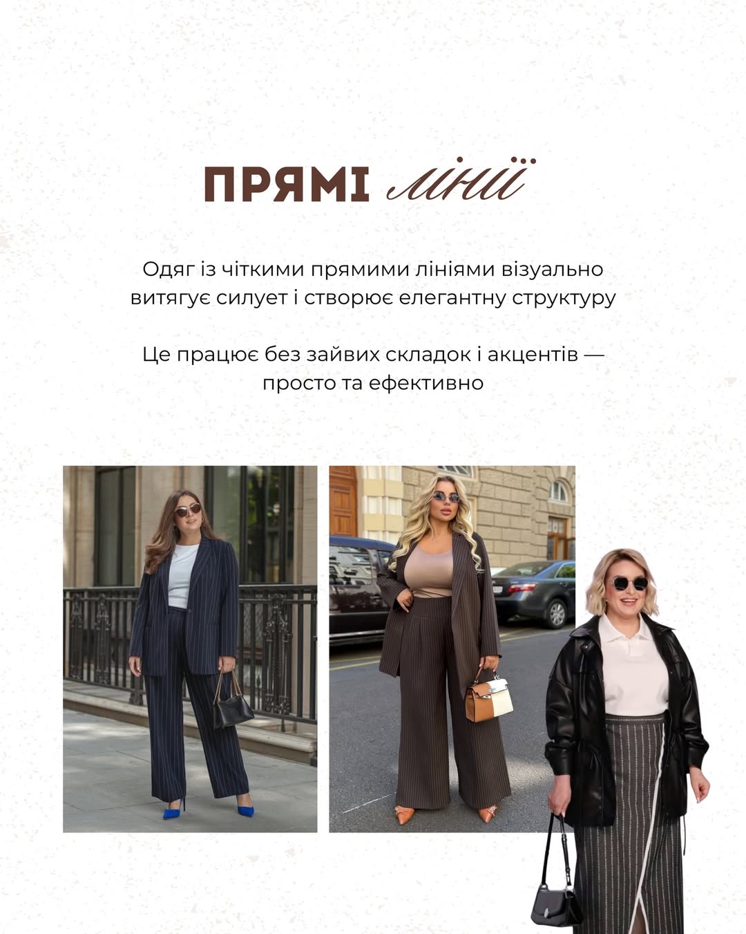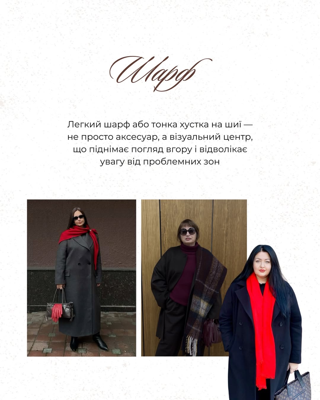 Легкий шарф або тонка хустка на шиї - не просто деталь, а візуальний центр образу. Вони підіймають погляд угору та відвертають увагу від проблемних зон. Також дизайнер радить обирати кольорові аксесуари - наприклад, великі сумки або шарфи без принтів, щоб не перевантажувати образ.
