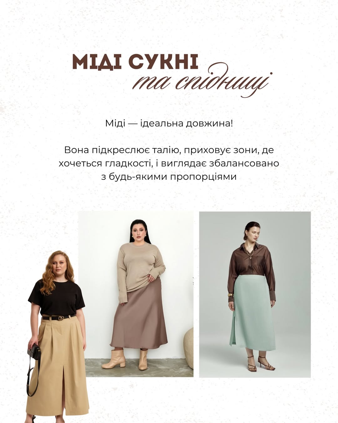 Особливу увагу дизайнер радить звернути на сукні та спідниці міді. Ця довжина вважається найбільш виграшною, адже вона підкреслює талію, приховує зони, які не хочеться акцентувати, і водночас виглядає пропорційно з будь-яким типом фігури. Міді створює відчуття балансу й жіночності.