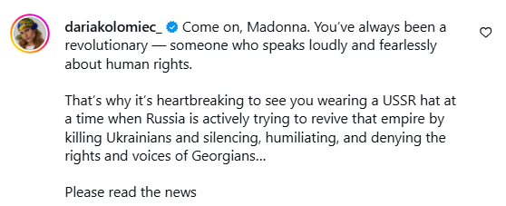 "Ну ж бо, Мадонно. Ти завжди була революціонеркою - людиною, яка голосно і безстрашно виступає за права людини. Так боляче бачити тебе в капелюсі СРСР у час, коли Росія активно намагається відродити цю імперію, вбиваючи українців і придушуючи, принижуючи та заперечуючи права і голоси грузинів", - написала вона.