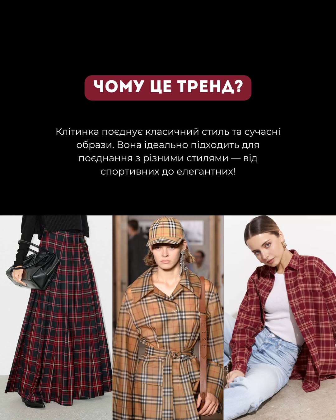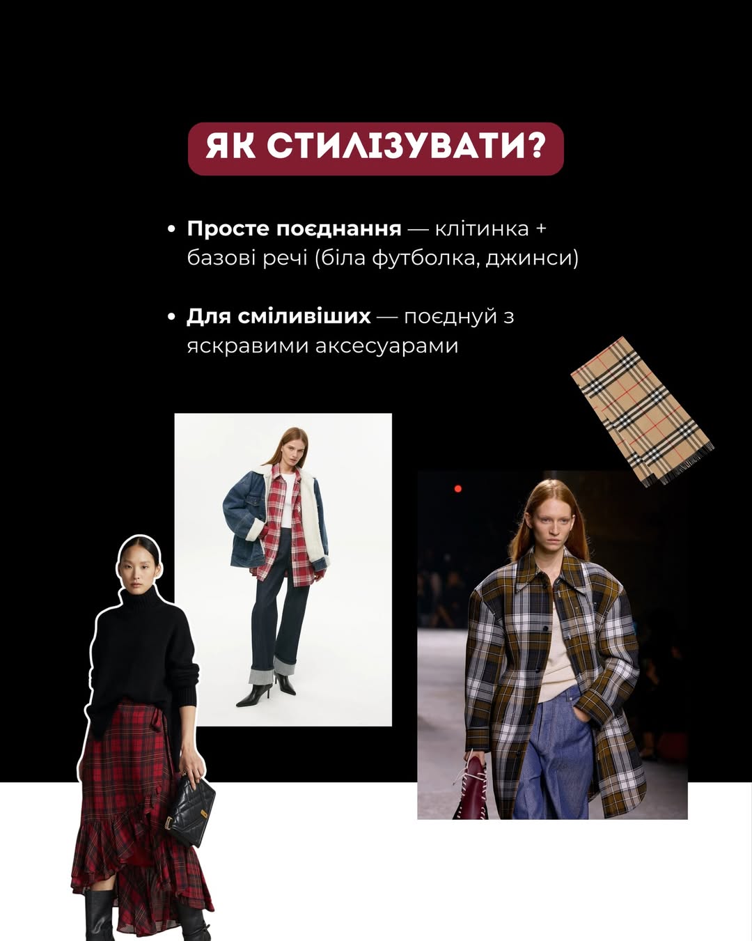 Серед актуальних образів - класичний casual із картатою сорочкою, елегантний вечірній "лук" із довгою спідницею в тартан та подіумний стиль із подовженим пальтом у велику клітинку природних відтінків.