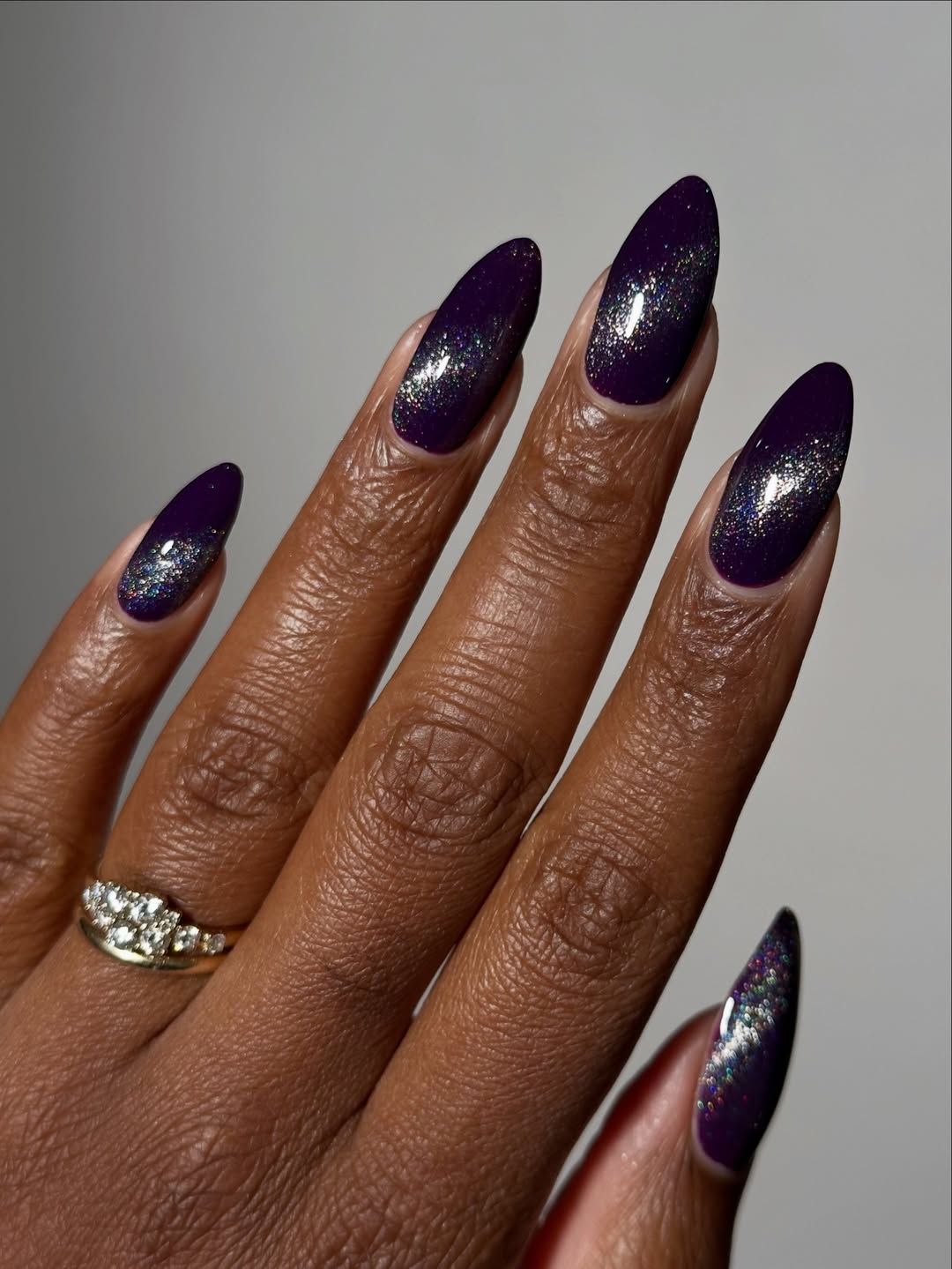 Астральний пурпур - щасливий колір манікюру на лютий 2026 року. Темно-фіолетові нігті з блискітками не тільки виглядають стильно, а й приваблюють удачу, гроші та кохання.