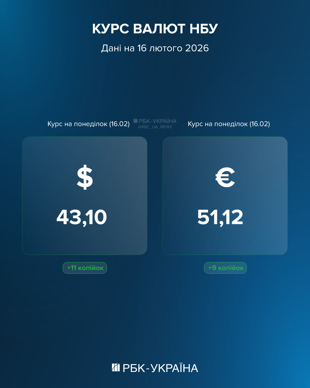Фото: курс валют на 16 лютого (інфографіка РБК-Україна) Курс валют НБУ Після вчорашнього падіння Нацбанк знову перейшов до підвищення курсу валют. Так, на понеділок, 16 лютого, офіційний курс долара встановлено на рівні 43,10 (+11 копійок) гривень. Євро ж на початку тижня коштуватиме 51,12 (+9 копійок) гривню. Що відбувається з курсом Як пояснив у коментарі РБК-Україна директор департаменту фінансових ринків та інвестиційної діяльності "Глобус банку" Тарас Лєсовий, валютний ринок України входить у середину лютого без критичних "перегинів". Це означає: