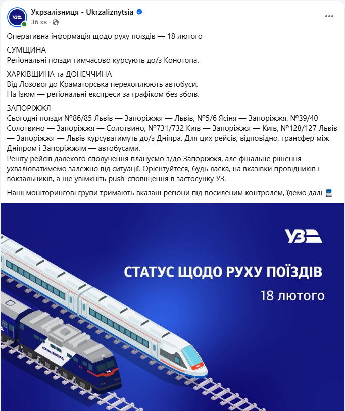 Оперативна інформація про рух поїздів 18 лютого (скриншот: facebook.com/Ukrzaliznytsia)