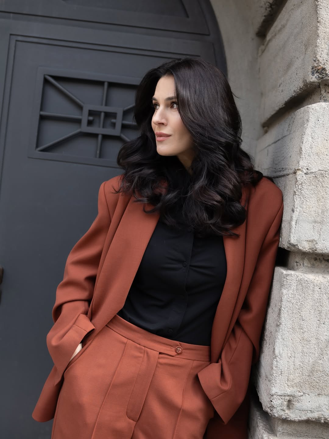 Теракотовий (або цегляний) колір став головним акцентом аутфіту. Глибокий, теплий відтінок виглядає благородно та водночас не надто формально, що дозволяє легко адаптувати костюм як для офісу, так і для неформальних заходів.