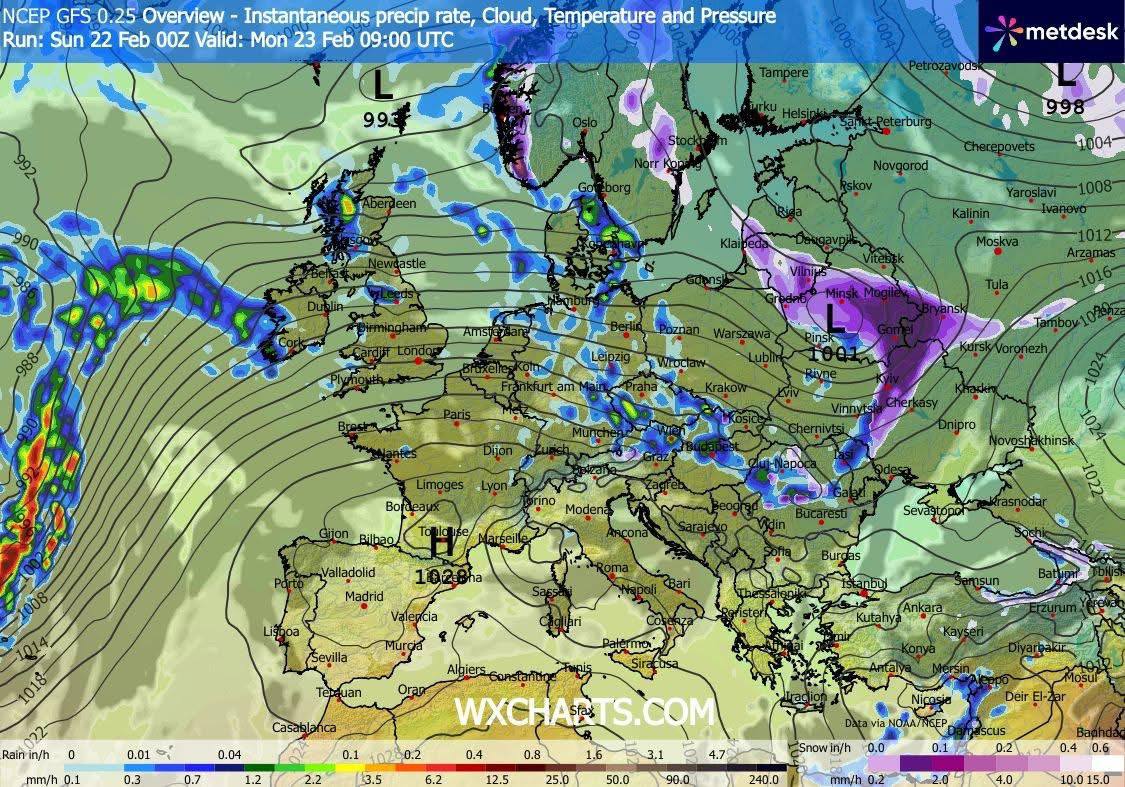 У понеділок, 23 лютого, в Україні очікується потепління, однак погода буде вітряною та вологою. У більшості областей прогнозують дощ і мокрий сніг.