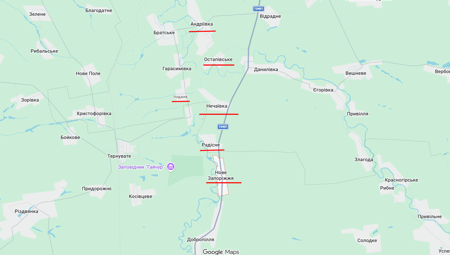 За оцінками ISW, українські війська нещодавно звільнили Андріївку, Остапівське, Піщане, Нечаївку, Радісне та Нове Запоріжжя. Окрім того, аналітики не спостерігали візуальних доказів присутності військ РФ в жодному з цих населених пунктів протягом понад двох тижнів.