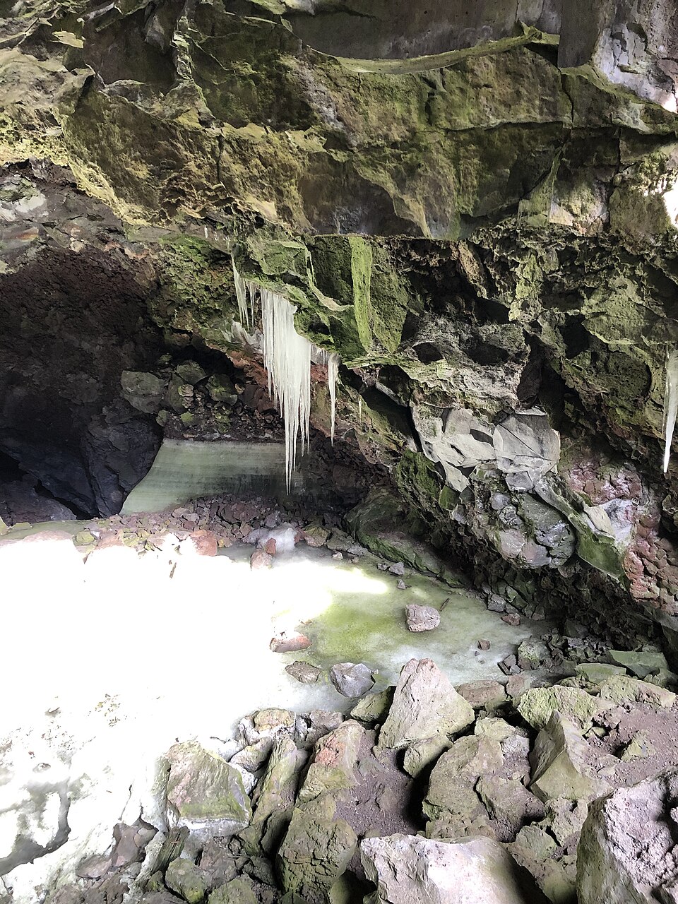 Лід у печері під вулканом Бандера (фото: Вікіпедія) Лід тут має товщину близько 6 метрів і не тане вже понад 3400 років, переливаючись зелено-блакитними відтінками через особливі арктичні водорості. За словами археологів, пізні люди Анасазі та ранні люди Пуебло населяли печеру, залишивши після себе безліч кам'яних знарядь праці, черепків кераміки та багато повністю неушкоджених гончарних посудин. Лавові камені люди Анасазі складали у стіну, що ізолювала їхні укриття. Як це можливо Секрет в особливій циркуляції повітря: