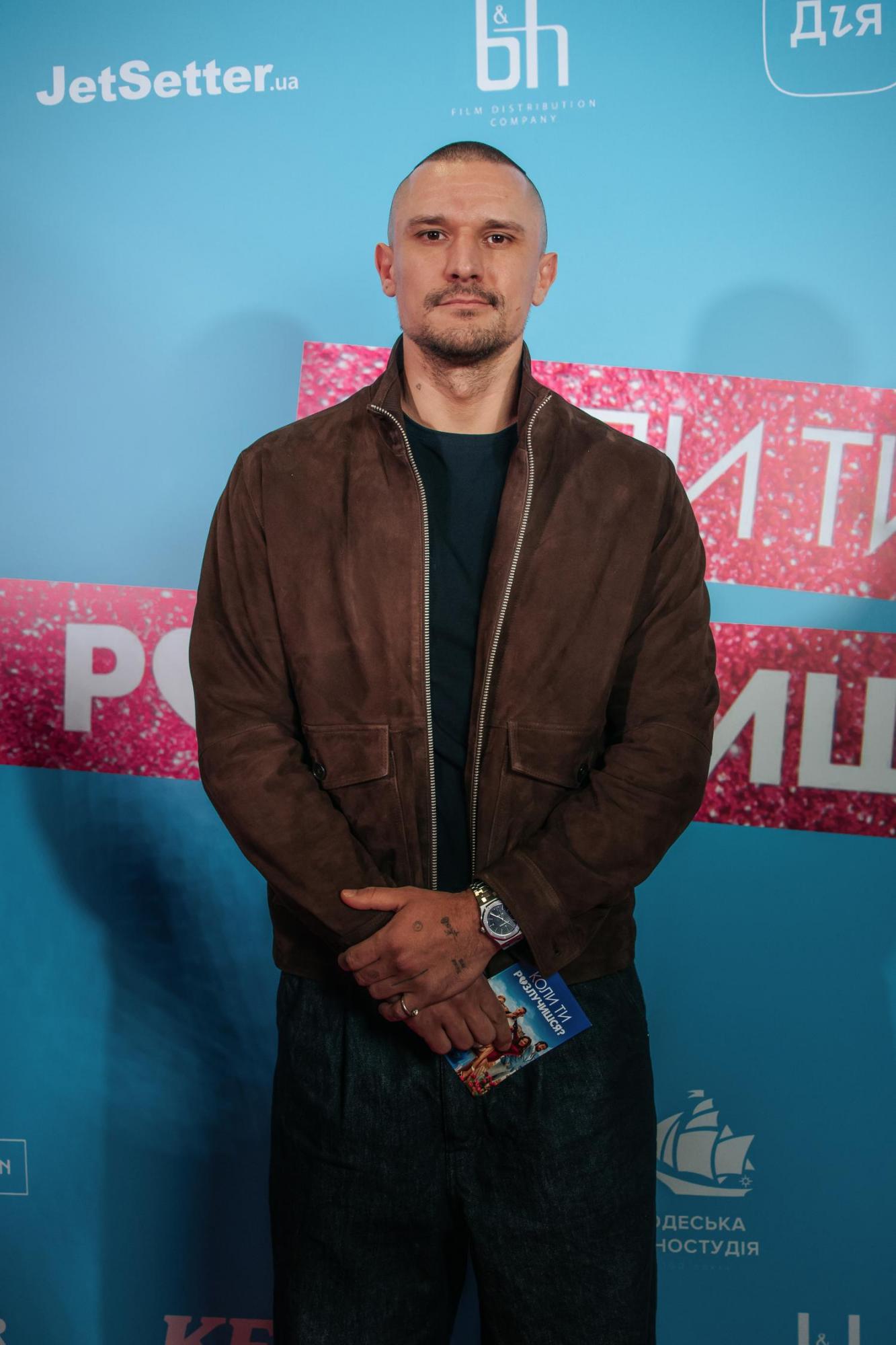 Актор зробив ставку на поєднання замші та оверсайзу. Глибокий шоколадний бомбер з накладними кишенями та комірцем-стійкою підкреслив спортивну статуру Цимбалюка, а темно-синій лонгслів і джинси raw denim у вільному крої додали актуальної недбалості.