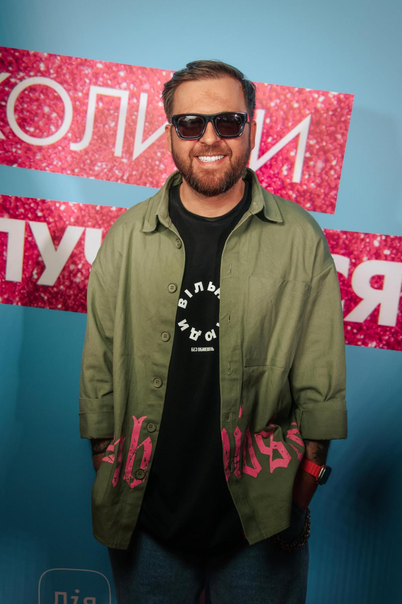 Фронтмен гурту "Без обмежень" продемонстрував вуличний стиль із творчим підходом. Основою стала оверсайз-сорочка кольору хакі з яскравим рожевим графіті-принтом, яку артист носив як легку куртку. Під нею - чорна футболка з фірмовим написом гурту додала брендового акценту.