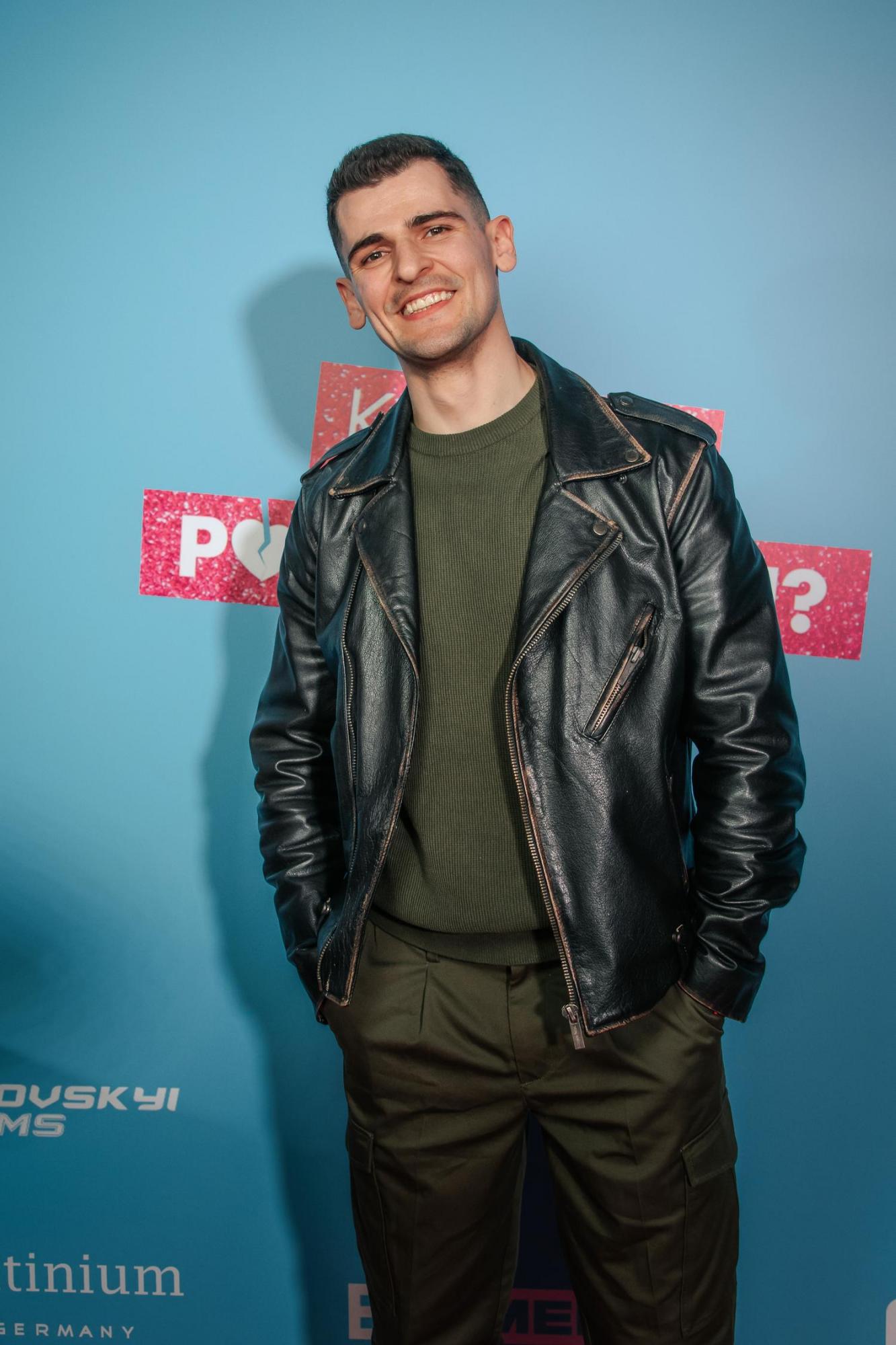 Блогер і автор рубрики "Скільки коштує ваш лук?" обрав образ, який поєднує рок-н-рольну шкіру та сучасний urban military стиль. Чорна шкіряна косуха з легкими потертостями, масивною фурнітурою та замками створює брутальний характер, а джемпер у відтінку темної оливи додає тепла і м’якої фактури.