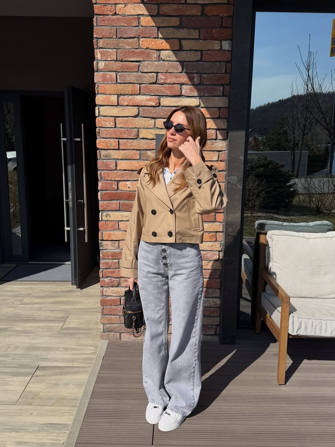 - Короткий тренч + джинси з високою посадкою візуально видовжують ноги та підкреслюють талію.