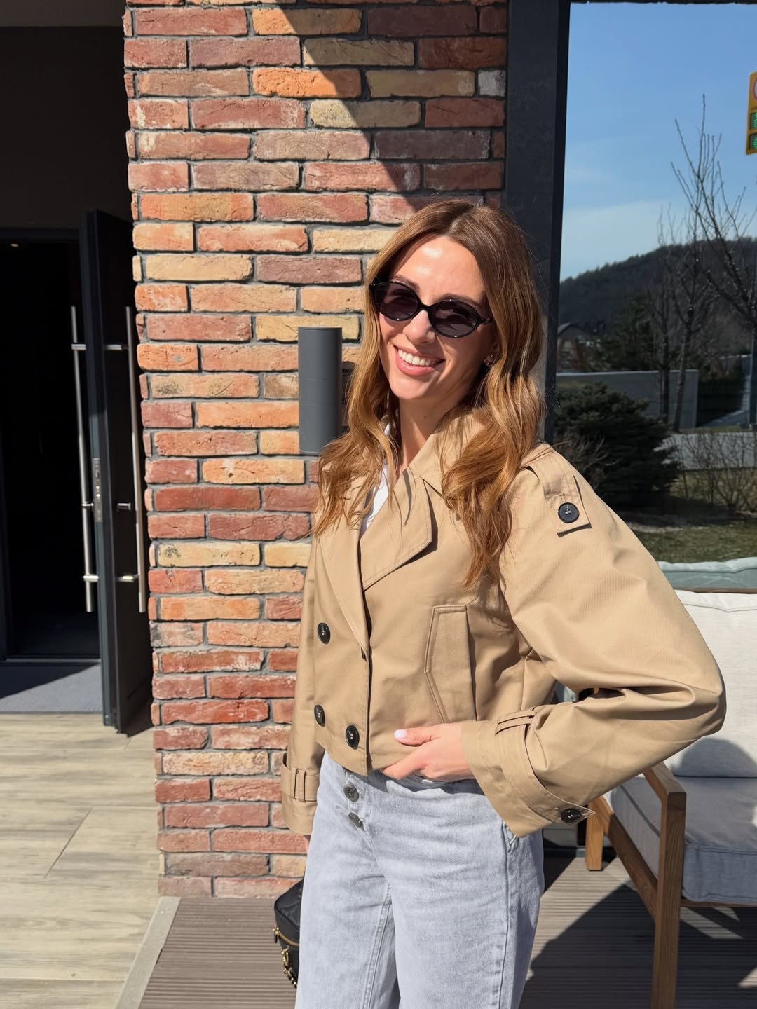 Головний акцент - тренч пісочного кольору у скороченій версії. Така довжина підкреслює талію та робить силует легким і динамічним. Двобортний фасон із контрастними гудзиками і акцентними патами на манжетах додає образу структури та сучасної грайливості.