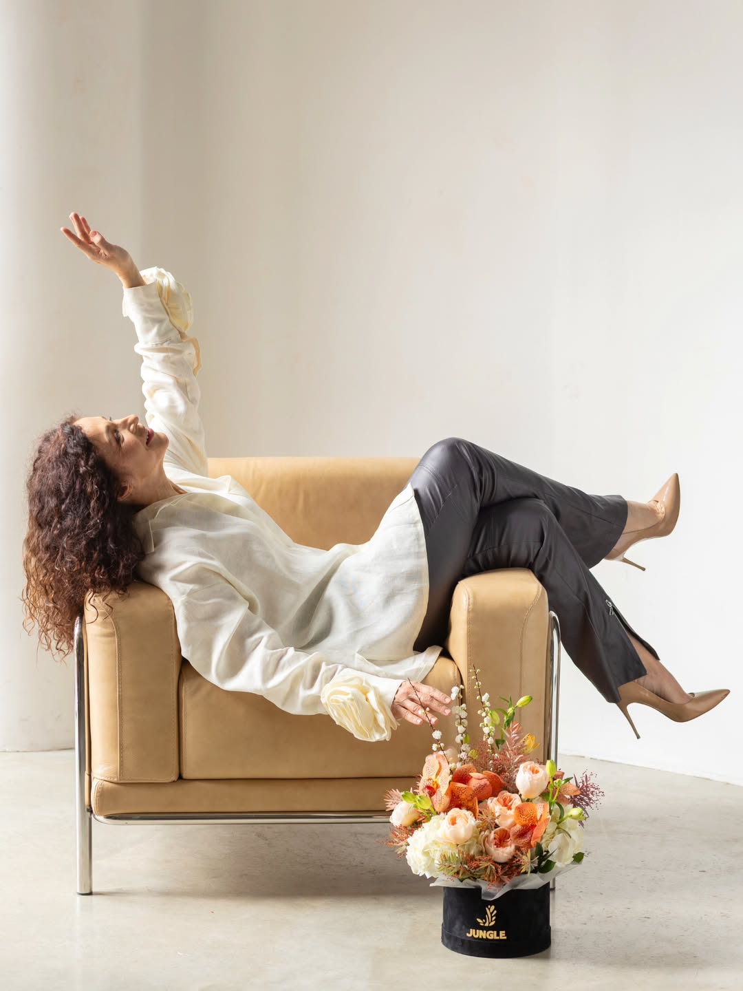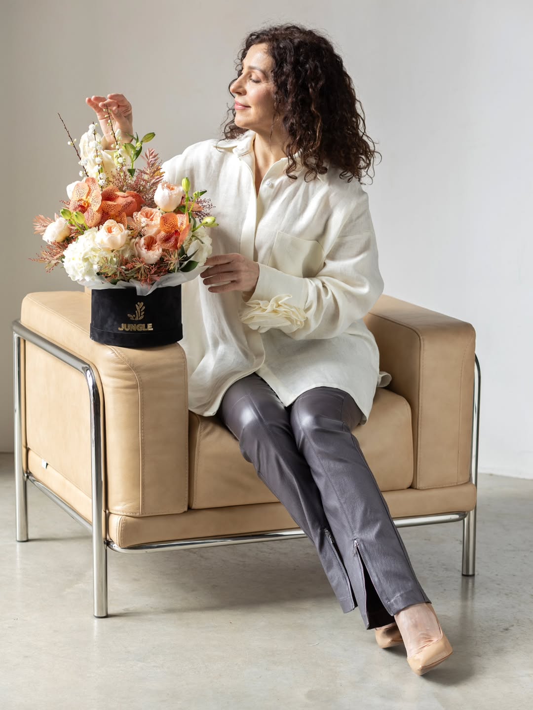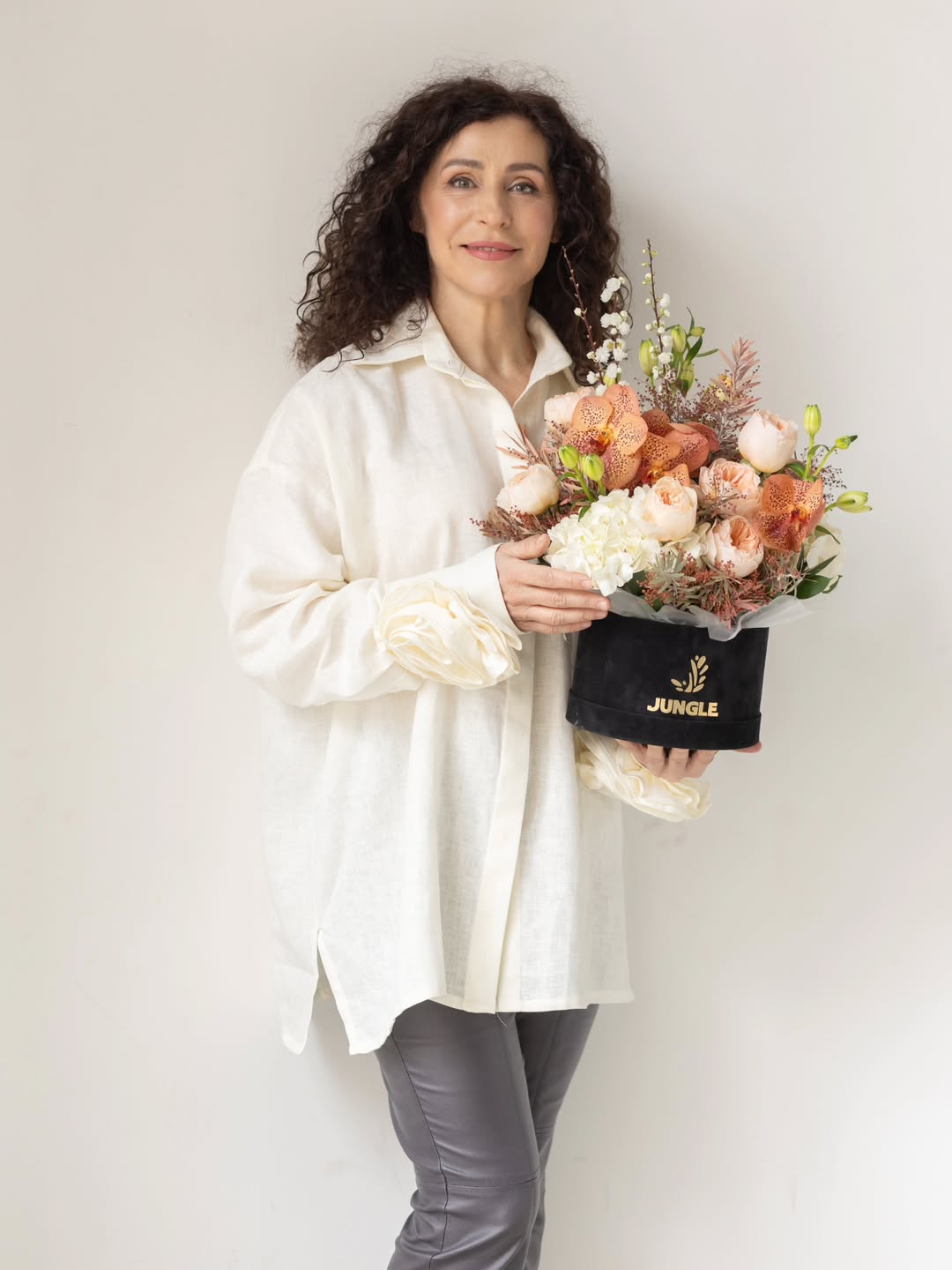 Свій образ Надія доповнила білою оверсайз-сорочкою з оригінальним декором на рукавах у вигляді об'ємних квітів. Таке поєднання грубої фактури шкіри та ніжної тканини верху створює цікавий контраст.