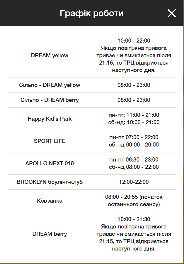 Графік роботи ТРЦ DREAM (скриншот: dreamtown.ua)