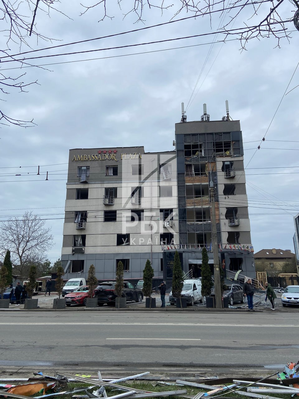 У Подільському районі також пошкоджено будівлю готелю "Ambassador Plaza". На фото видно пошкодження фасаду та вибиті вікна на верхніх поверхах.