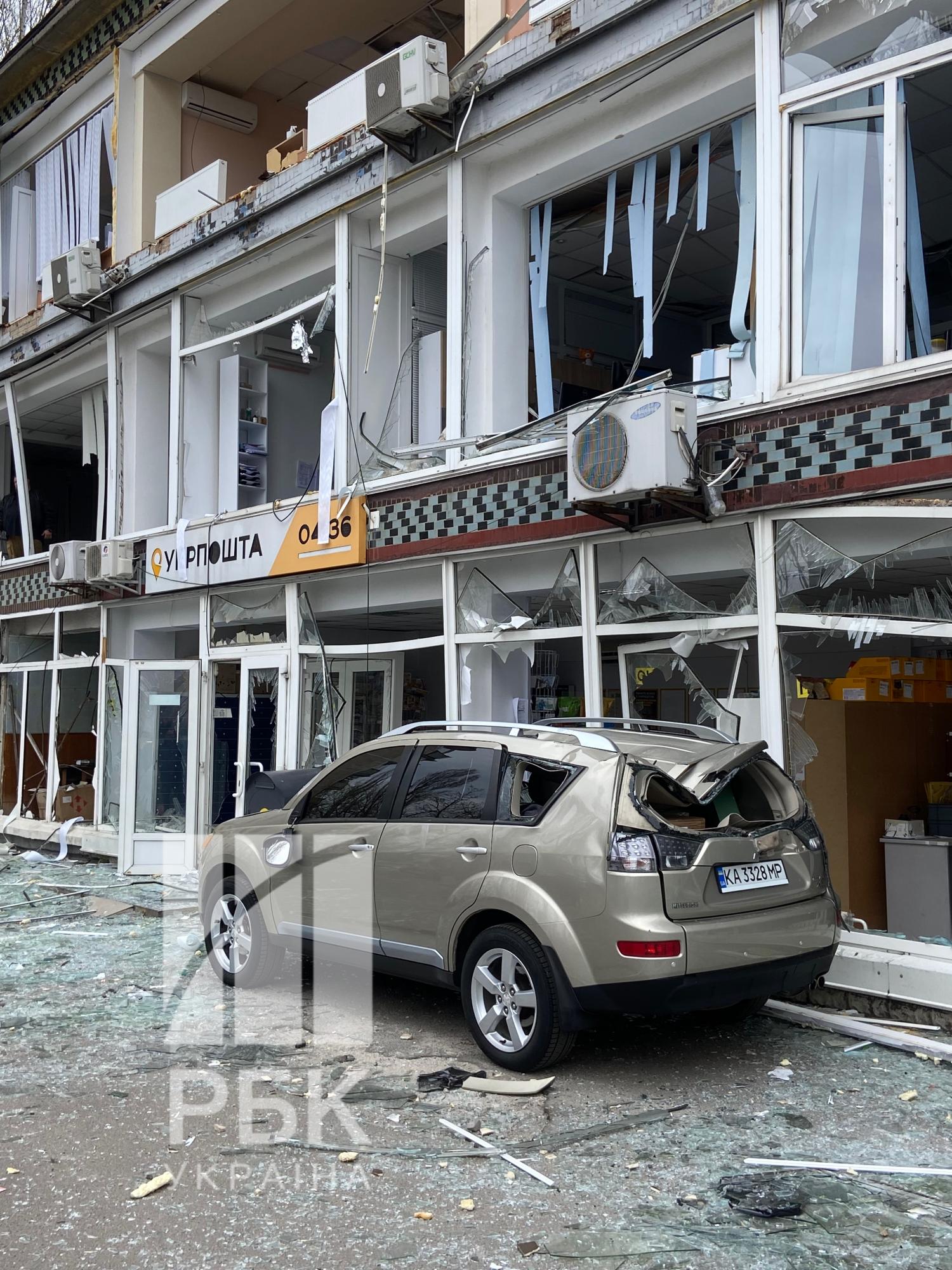 На фасаді будівлі, поруч із вивіскою "Укрпошта", видно пошкодження і на верхніх поверхах, де вибиті вікна. Скло та уламки будівельних матеріалів вкрили тротуар і проїжджу частину.