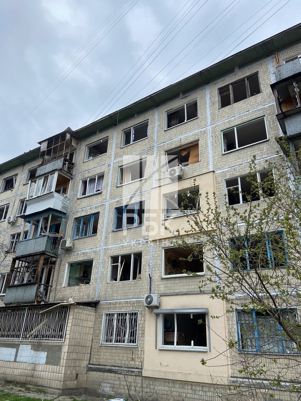 Фасади будинків посічені уламками, у багатьох квартирах вибиті вікна та балконні рами. На деяких поверхах вибухова хвиля вирвала конструкції балконів.